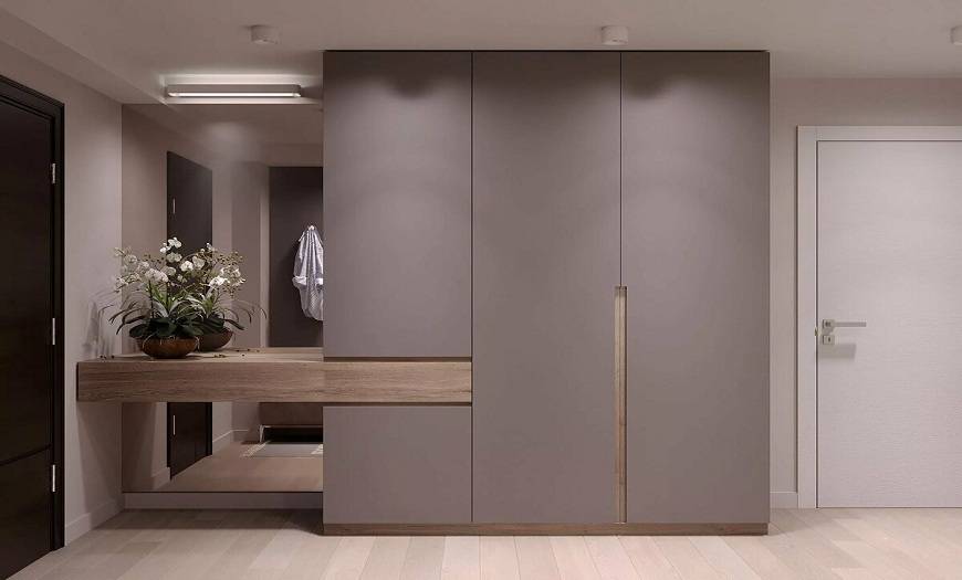 Отличным решением для хранения вещей будет шкаф-купе. Его можно встроить в нишу в прихожей, если она есть, что поможет сэкономить площадь. На двери шкафа установить большое зеркало, тем самым не нужно искать отдельное место для него.