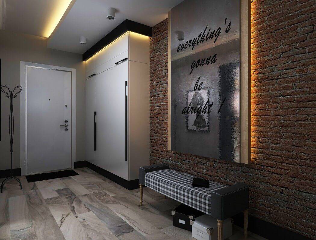 Кирпичные и бетонные стены – это первое, что приходит в голову при упоминании об интерьере в стиле лофт. В зависимости от площади прихожей, подбери белые или красные (коричневые) обои «под кирпич». Такое оформление будет великолепно сочетаться с жидкими или флизелиновыми обоями пепельно-белых тонов.
