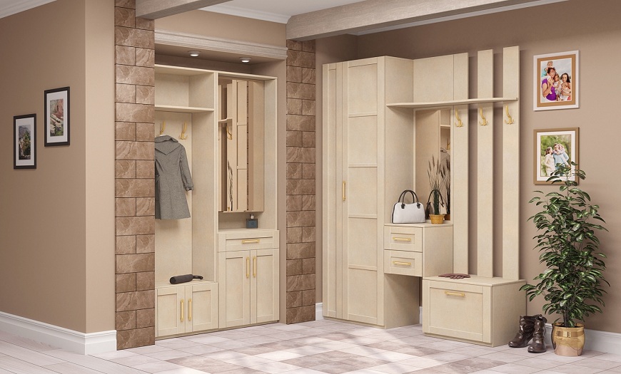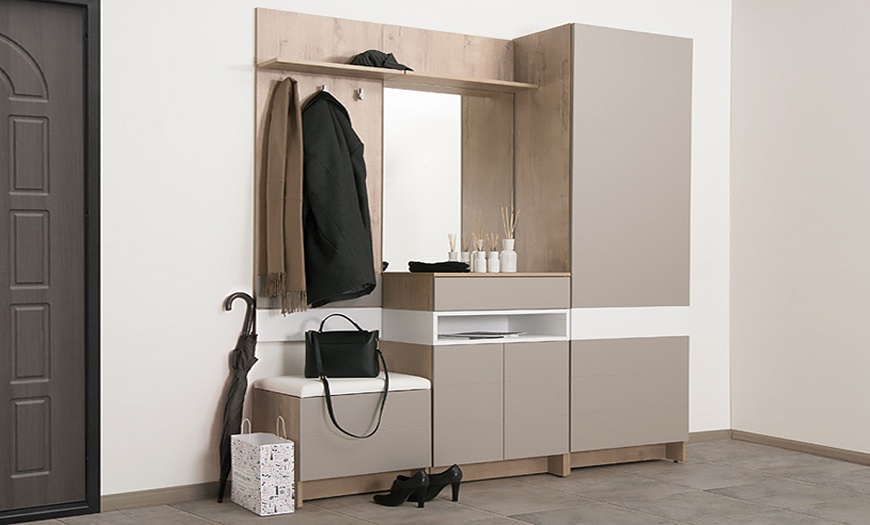 Минимальный комплект для прихожей небольших габаритов включает шкаф или вешалку, полку для обуви, пуфик и зеркало