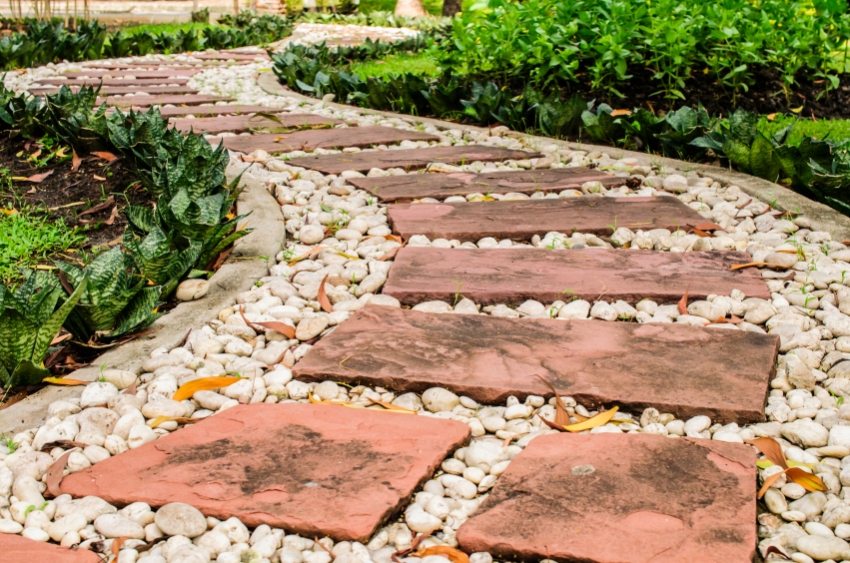 Гравий и щебень очень привлекательный материал для сооружения садовых дорожек. Но такой вариант лучше рассматривать в качестве декора. Ходить по щебенке босиком не получится.