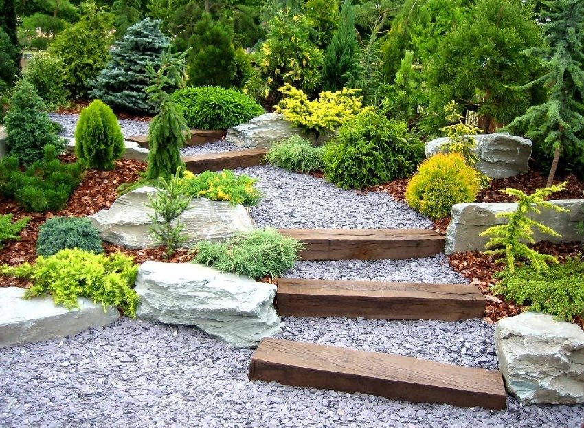 Каменные тропинки из крупного гравия также отлично впишутся в дизайн сада. А из гальки можно выложить целые композиции, используя различные цвета и формы этого материала.