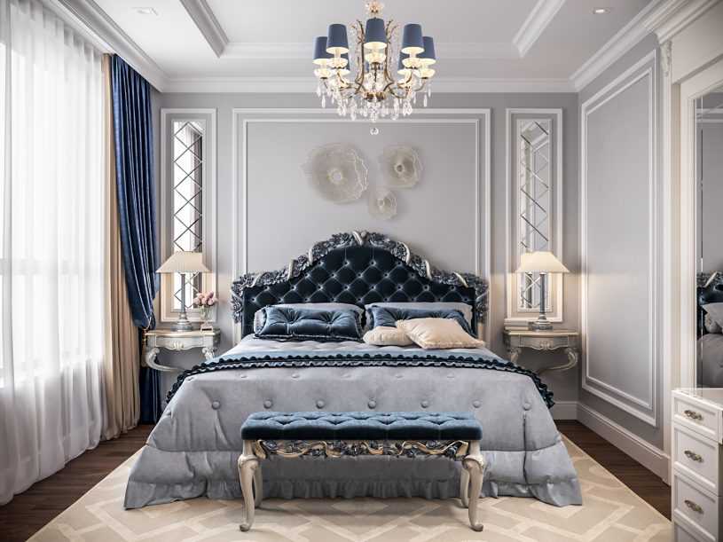 Классический дизайн спальни в голубом цвете можно описать только одним словом – роскошный