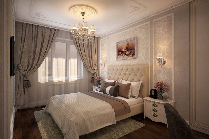 Классические спальни также «любят» все виды текстиля в светлых пастельных тонах, а также обои с нежными узорами.