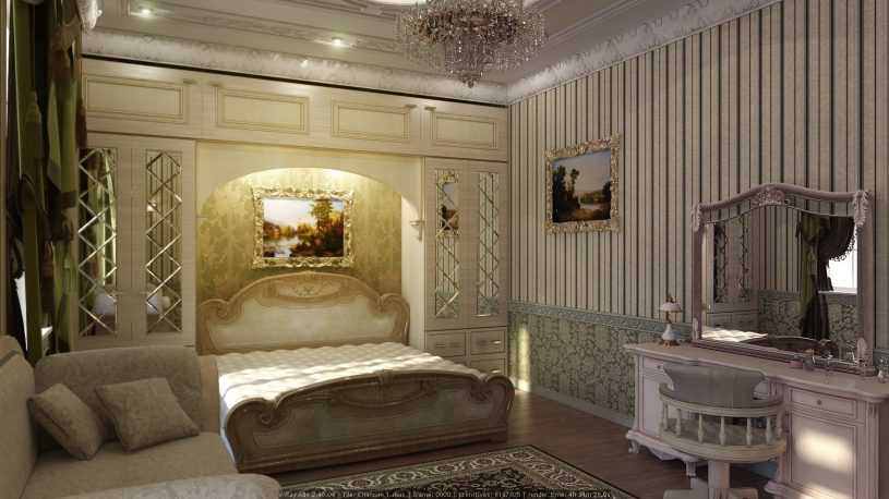 Спальня в классическом стиле не раскроется в маленькой комнате с очень низким потолком. Габаритная мебель занимает много места и не мешает свободному перемещению. Визуально увеличить пространство помогут тонкие вертикальные полоски на обоях.