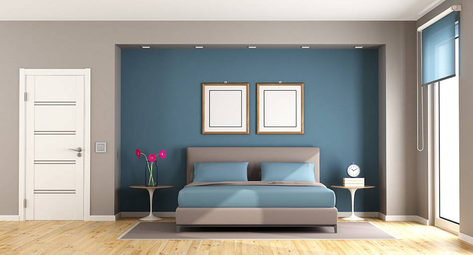 Для отделки стен в спальне можно использовать побелку, покраску, штукатурку, деревянные панели, обои с неброским, мелким рисунком или однотонные.