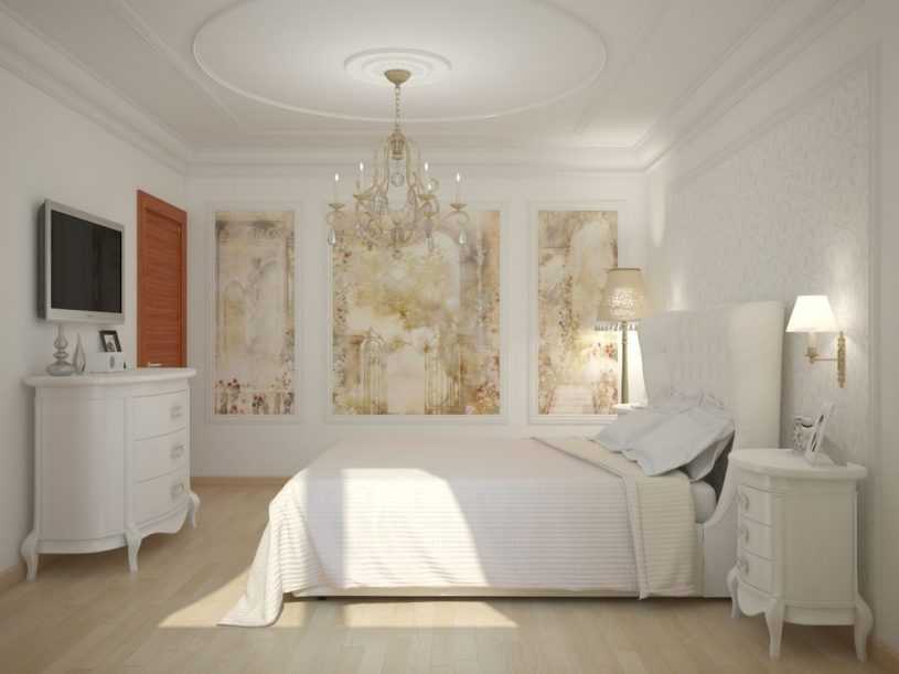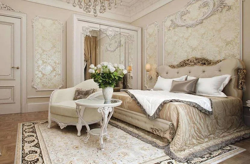 В декорировании спальни применяются различные предметы искусства, картины, статуи и вазы в большом количестве. Стены украшаются оригинальными полотнами, в квартирах людей среднего достатка приемлемо использование репродукций, где предпочтение отдают известным художникам.
