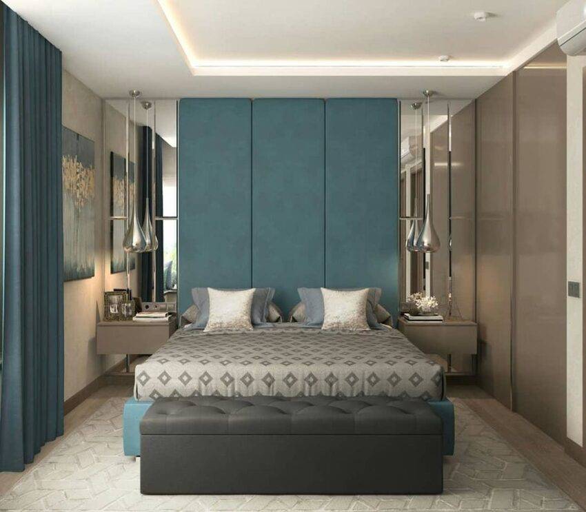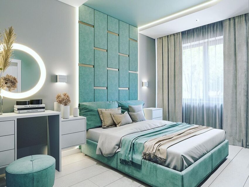 На фото модерновый интерьер спальни, выдержанный в серо-бирюзовых тонах.