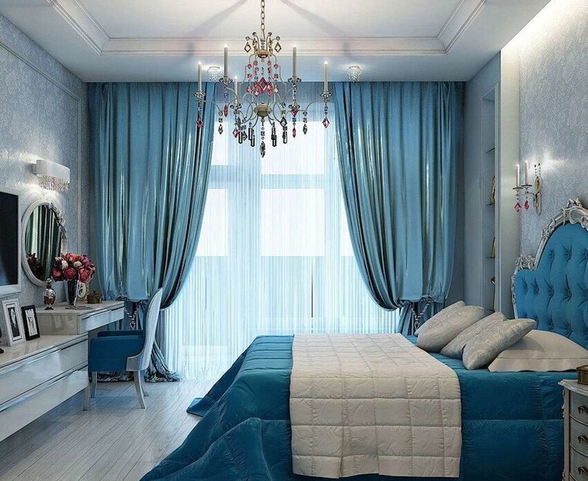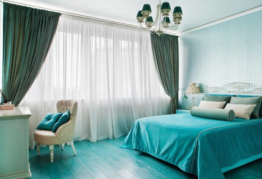 Бирюзовый в данной композиции будет главенствующим, также не плохо будут смотреться бирюзовые шторы в спальне.