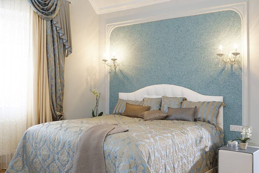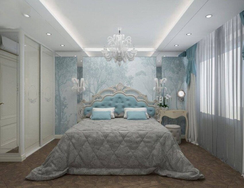 На фото стены, оклеенные комбинированными обоями цвета бирюзы в спальной комнате в стиле классика.