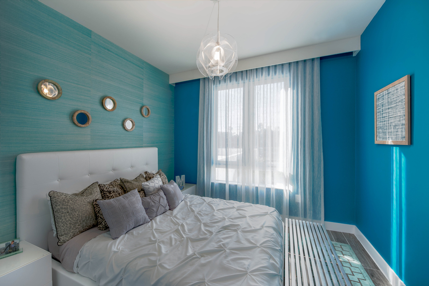Цвет морской волны может легко создать ощущение близости моря, вызвать эмоции, связанные с ним. Даже небольшая спальня станет уютнее, визуально больше, если правильно использовать бирюзовый цвет и его оттенки. Часто одна из стен спальни становится объектом, используемым для создания морской поверхности. В этом случае идеальным решением будет использование белого тюля, штор и покрывала бирюзового цвета.
