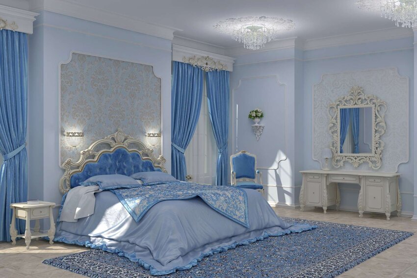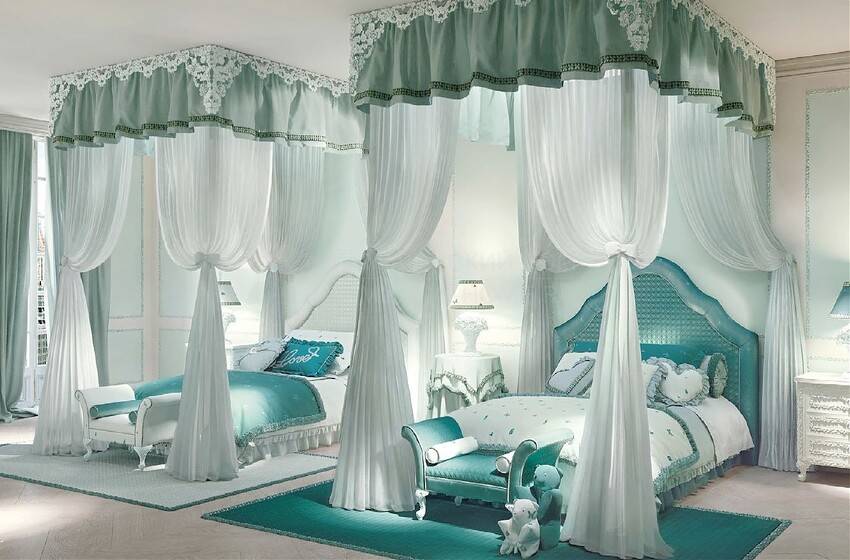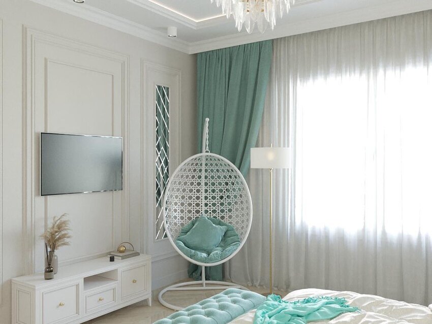 Классические интерьеры характеризуются помпезностью и размахом, а бирюза добавляет им элегантности и утонченности. Хорошо выглядят спальни, оформленные в светлой цветовой гамме со строгими линиями и бирюзовыми акцентами. В классическом интерьере бирюзовый может использоваться при подборе балдахина, гардины или других предметов декора.