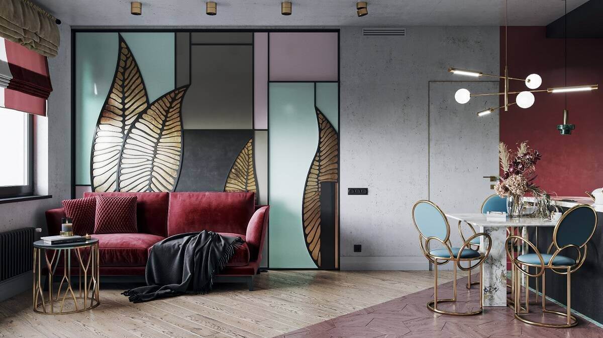 Нежно-бирюзовый в сочетании с ягодным красным и розовым станет хорошим фоном для оригинальных декоративных элементов цвета золота. Авторский проект «Клюква», дизайн-бюро Алёны Горской