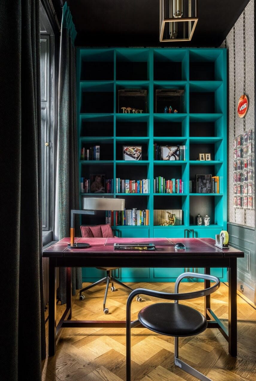 Респектабельные тёмные оттенки начинают звучать совсем иначе, когда в интерьере появляются яркие пятна, как здесь: бирюзовый книжный шкаф, тёмно-розовая столешница. В таком кабинете можно не только размышлять о судьбах мира, но и заниматься творчеством — обстановка располагает. Проект и фото — Елена Акимова