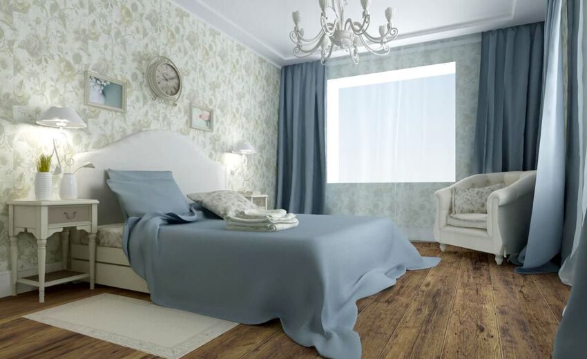 Бирюзовый цвет в интерьере спальни в стиле прованс, который отличается экологичной роскошью, провинциальной красотой и легкой романтичностью, позволяет еще больше подчеркнуть атмосферу нежности. Прекрасное сочетание — стены цвета небесной бирюзы с бежевыми или белыми мебельными предметами. Особой чувственности добавят дизайну текстильные элементы с цветочными мотивами.