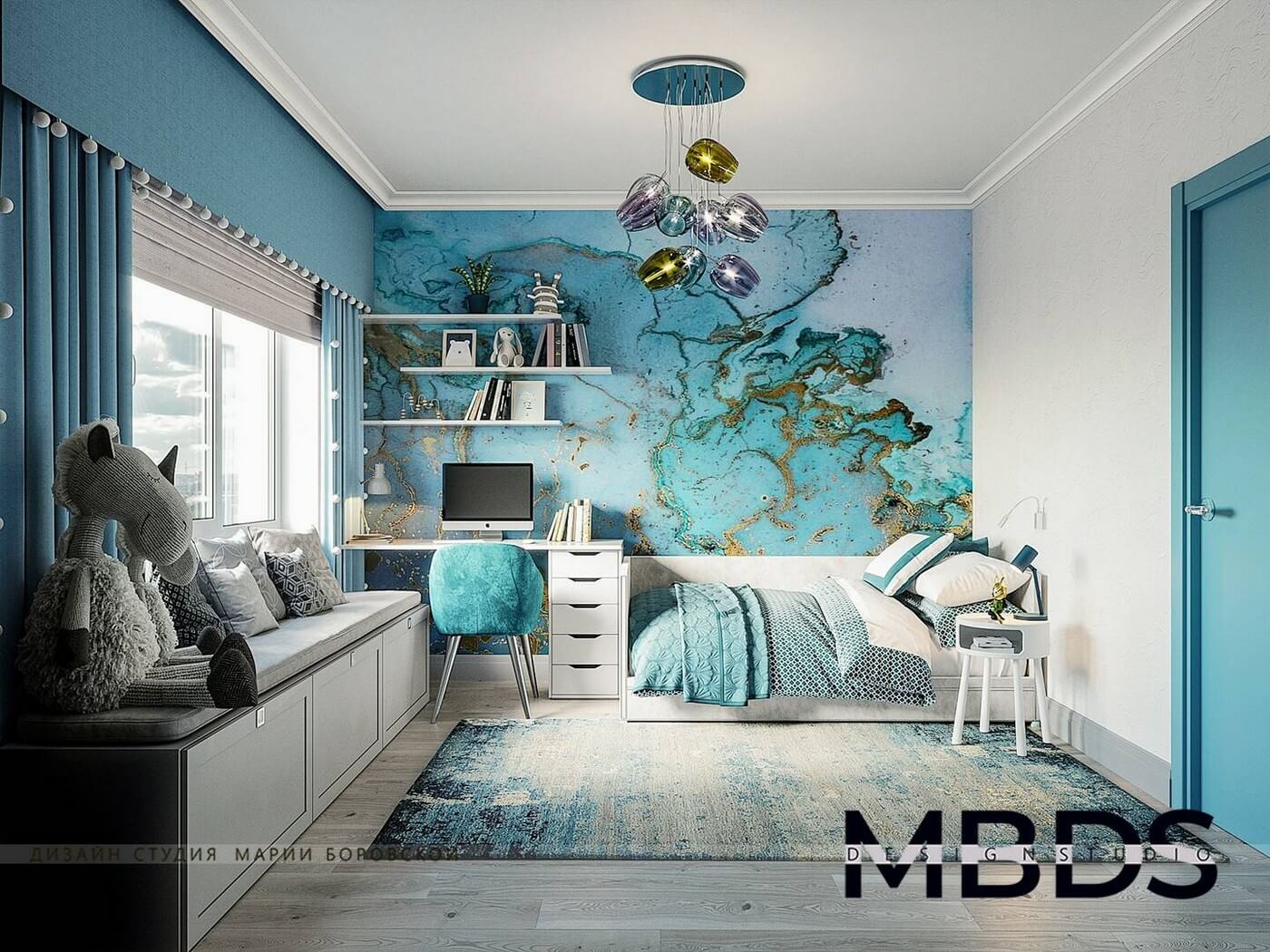 Бирюзовый цвет в детской — универсальное решение. Его можно разбавить белым, горчичным, жёлтым. Такая палитра подойдет и для мальчиков, и для девочек. Проект квартиры в ЖК «Наследие», дизайнер Мария Боровская