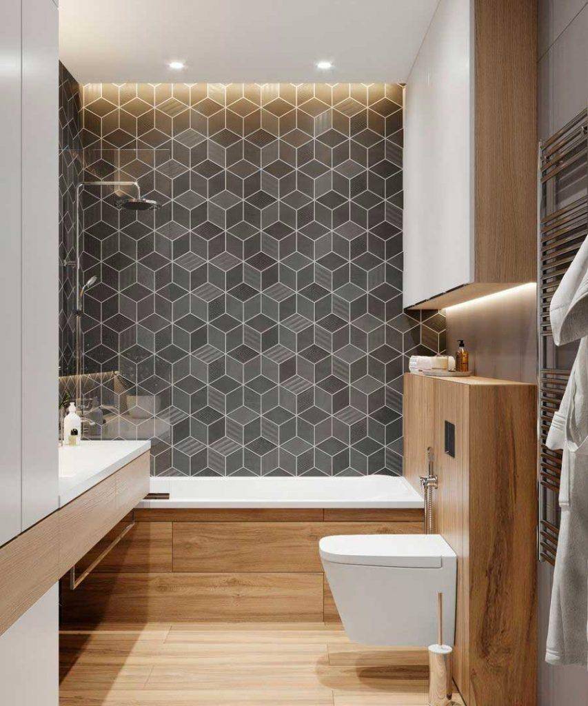 Если на полу уложен керамогранит с глубокой текстурой, то под тумбой или ванной можно сделать светодиодную подсветку. На фактурной плитке свет даст тени и объем — смотрится очень круто. Эффект парящей ванны: