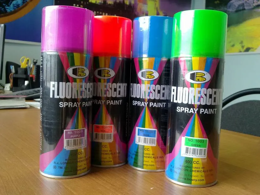 Флуоресцентные краски в баллонах выпускают на основе алкидуретана или акрила. Универсальное покрытие устойчиво к изменениям температуры, влажности и не боится солнца. Отделку дизайнеры применяют в экстерьерных и интерьерных работах, наносят на стекло, пластик и бетон. Из-за простоты использования можно легко нарисовать картину или сделать яркий акцент.