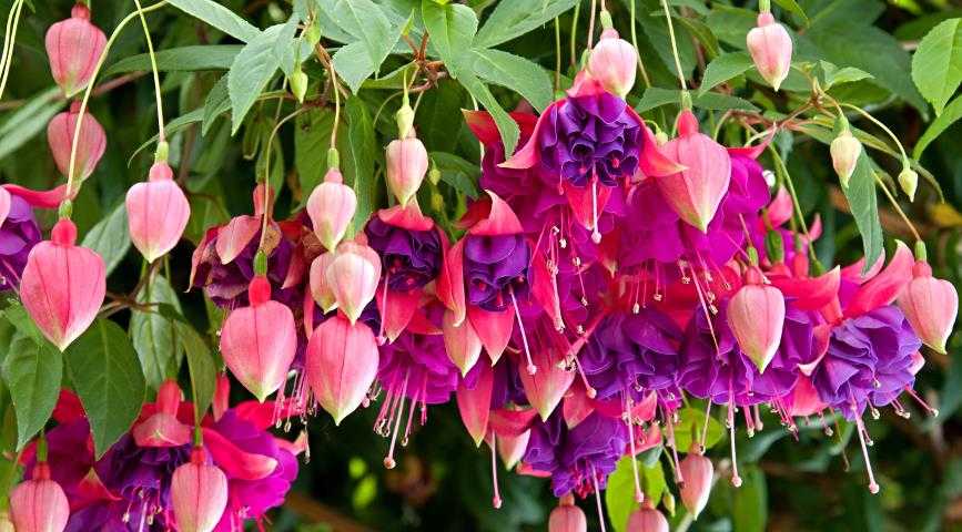 Различные сорта фуксии насчитывают множество махровых и полумахровых гибридов, отличие которых — это количество лепестков венчика. Лепестки цветов фуксии богаты разнообразием цветовой гаммы: они могут быть как белыми, так и фиолетовыми, багровыми или с красными чашелистиками. Еще цветы фуксии могут предстать собранными в рассыпчатые соцветия или так называемыми кистевыми гибридами.