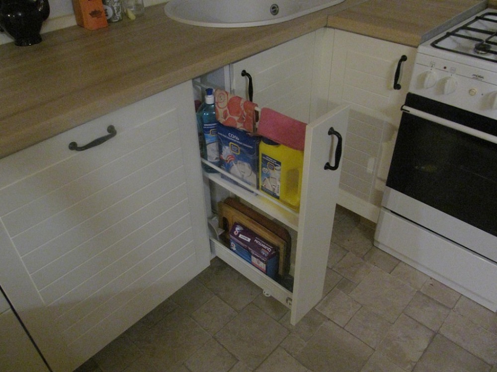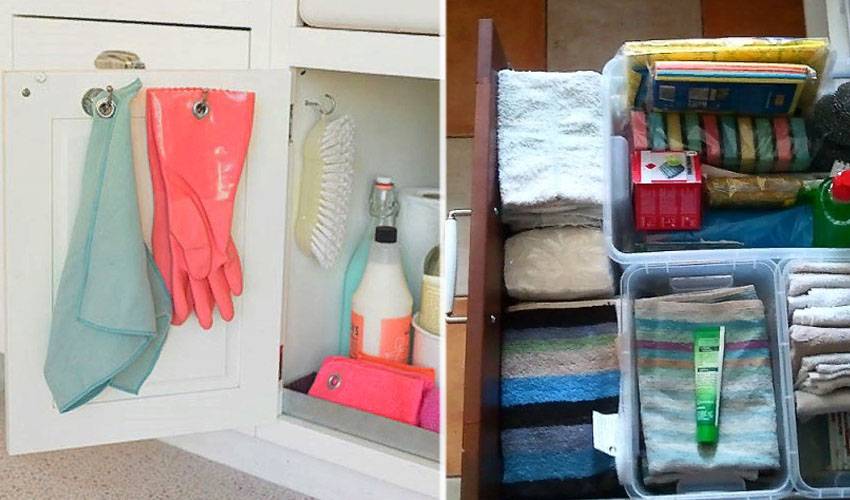 Если вы решили, что мусорному ведру не место под мойкой, у вас освобождается дополнительное место для хранения. Его не стоит использовать для запасов продуктов или посуды — повышенная влажность не пойдет им на пользу. А вот в качестве отсека под предметы кухонной гигиены шкаф под мойкой подходит идеально. Тут есть несколько общих правил: