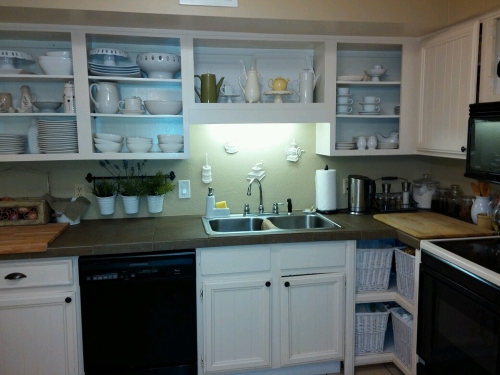 - Открытые полки не только экономят место, но и придают помещению особый вид. Все блюда будут видны. Единственный недостаток — необходимость частой чистки и чистки кухонной утвари.