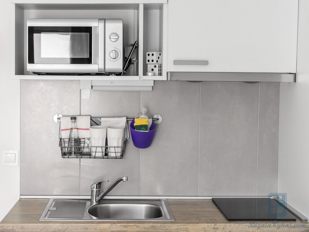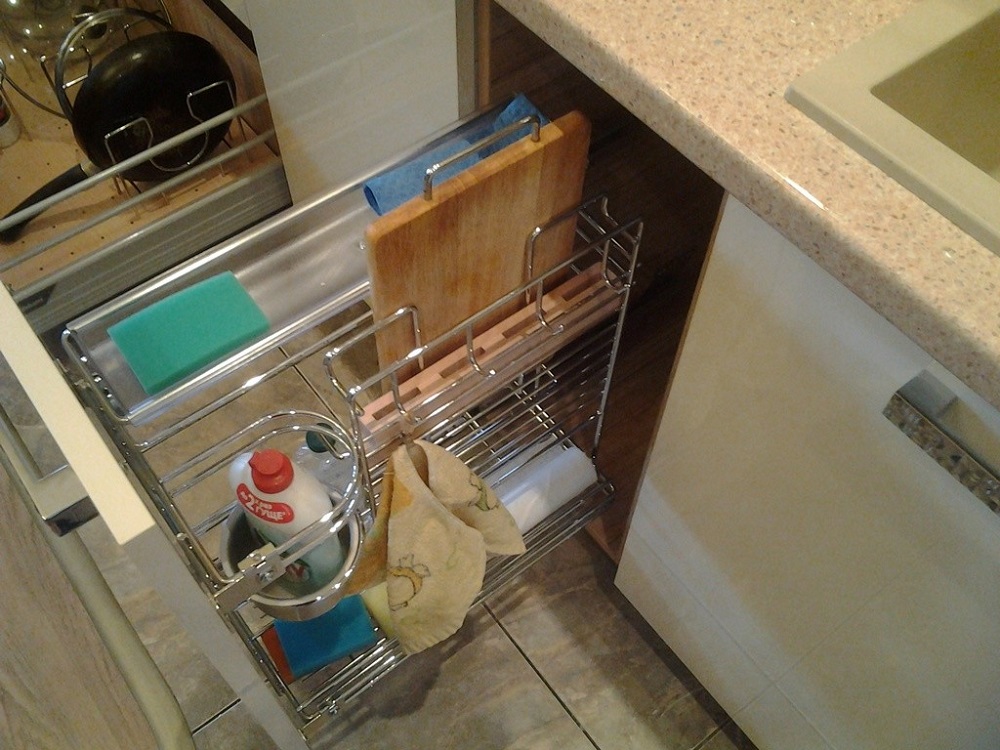 Если у вас маленькая кухня, непосредственно под раковиной рекомендуем сделать выдвижную полочку — она подойдет под хранение губок и скребков. Обычно это пространство не используется, так что можно считать, что вы подарите себе дополнительные квадратные сантиметры.