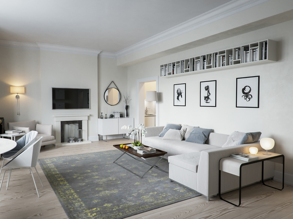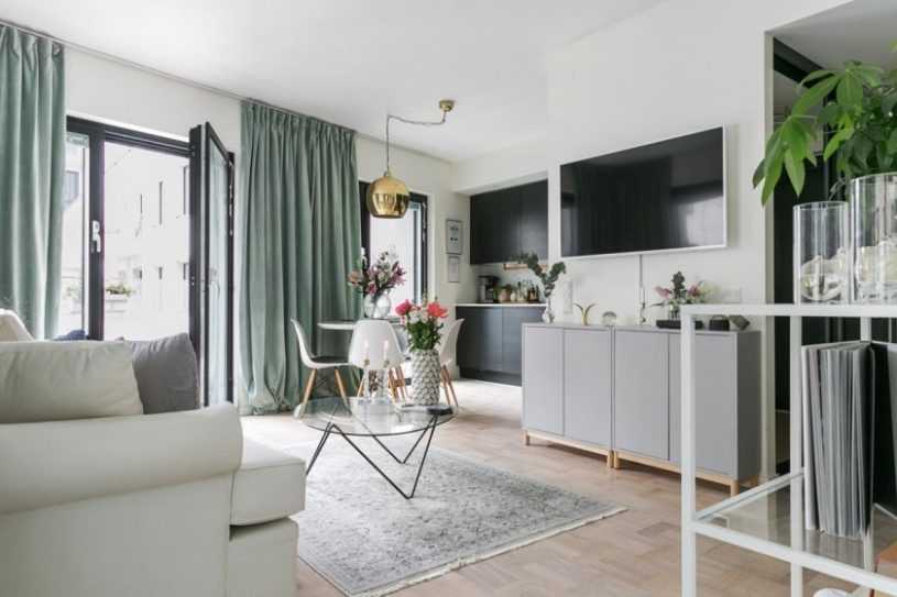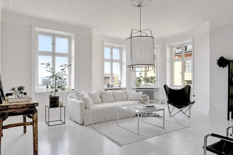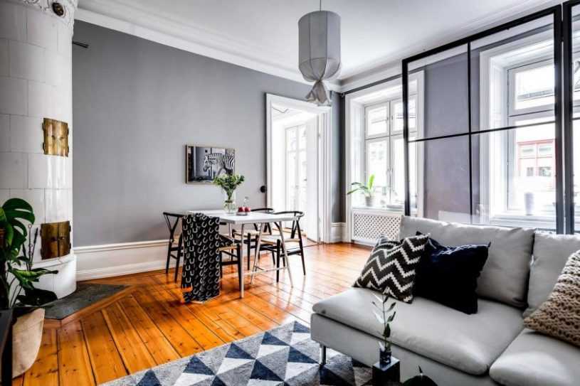 Цвета отделки предпочтительны светлые, лучше белые. Деревянное напольное покрытие может контрастировать со стенами. Мебель, обитая натуральными тканями, журнальный столик из дерева и металла, ковер в лаунж-зоне дополняются парой аксессуаров типа живых цветов в кадках. Несколько ярких подушек и стильных светильников завершат дизайн квартиры в скандинавском стиле.