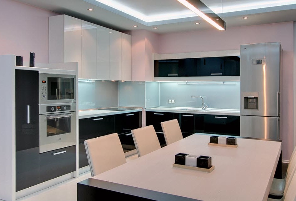 Для создания оригинальной обстановки при оформлении интерьера кухни-гостиной рекомендуется использовать кухонный гарнитур белого цвета