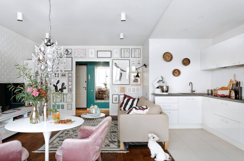 «Умный» декор – декоративные элементы подбираются с целью визуально расширить площадь и «поднять» потолки, чтобы квартира казалась больше и светлее. Поэтому приветствуется использование торшеров, бра, настенных и настольных ламп, зеркальных поверхностей и самих зеркал, но без массивных рам и обрамлений.