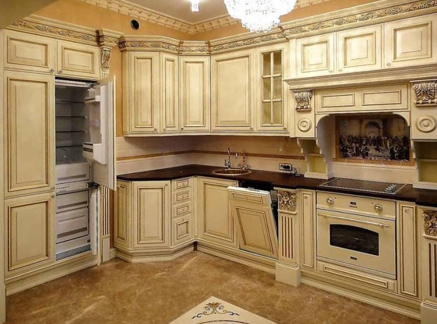 Прямой угол актуален для небольших помещений, а вот закругленная мебель позволит создать там место для готовки.