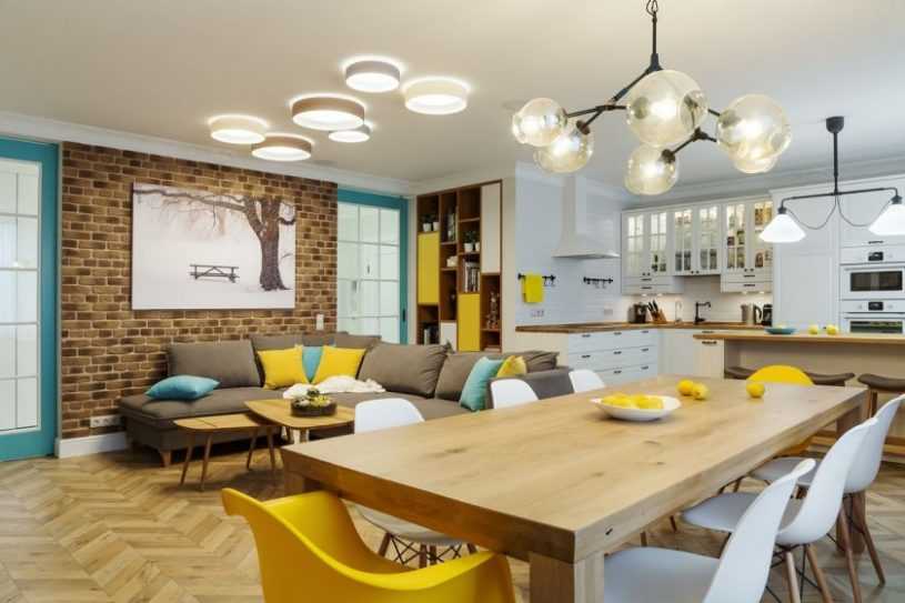 Разделяющим и объединяющим кухню-гостиную островом будет обеденный стол. Его деревянная столешница будет перекликаться с аналогичными элементами обстановки, расцветка или обивка стульев – с мебелью в гостиной.