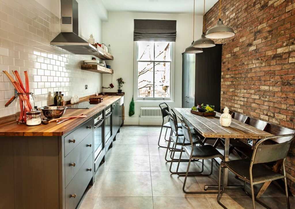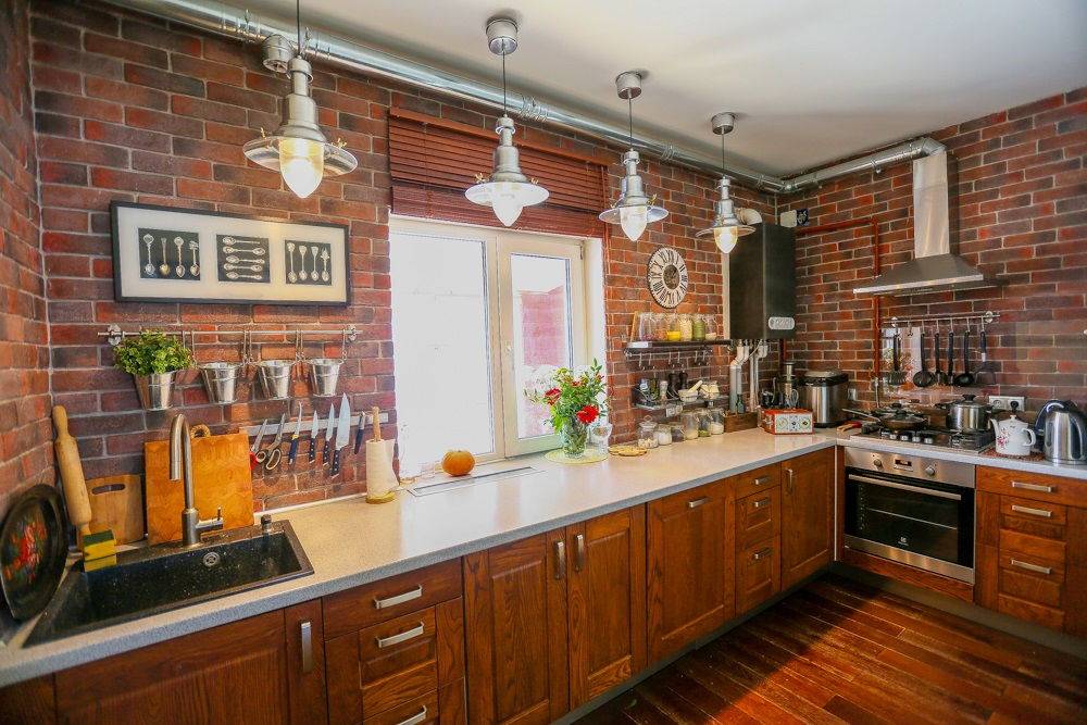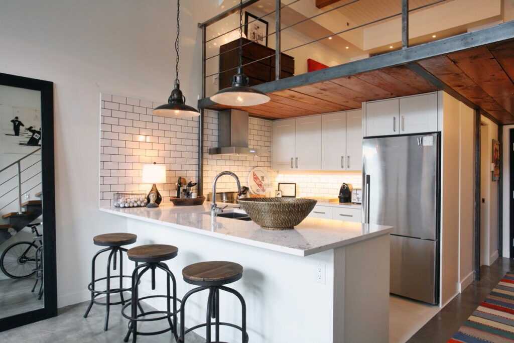 Конечно, намного проще воссоздать элементы стиля в кухне-студии с высокими потолками. В этом случае можно продумать лестницу на второй этаж, где желательно организовать зону отдыха, или же просто разместить под потолком вентиляционные трубы или деревянные балки. Но даже если дизайн разрабатывается в условиях небольшой площади и низких потолков, то с помощью светлых оттенков на потолке и стенах пространство можно визуально расширить. Также зрительно увеличивает габариты помещения зеркало, установленное напротив окна.