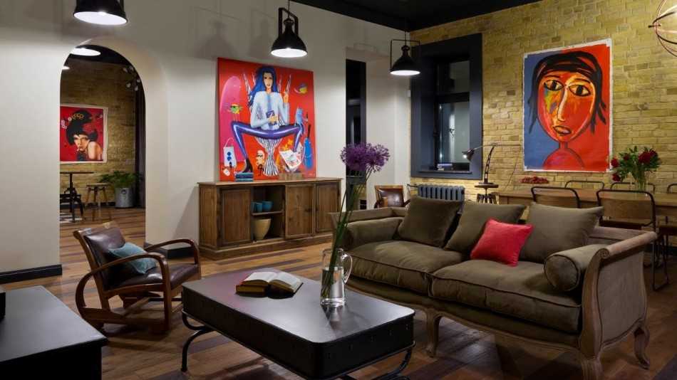 Стены и стеллажи украшают картины в стиле поп-арт, винтажные дорожные знаки, граффити, рекламные постеры или афиши.