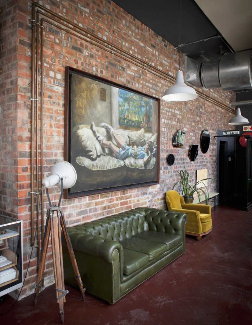 Визитной карточкой лофта является кирпичная кладка. Кто-то использует и декорирует оригинальную кладку кирпичного дома, кто-то укладывает ее специально. Но стоит учесть, что кирпичная кладка съедает пространство, поэтому часто делают просто ее имитацию. Для этого используют гипсовые или пластиковые панели имитирующие кирпич.
