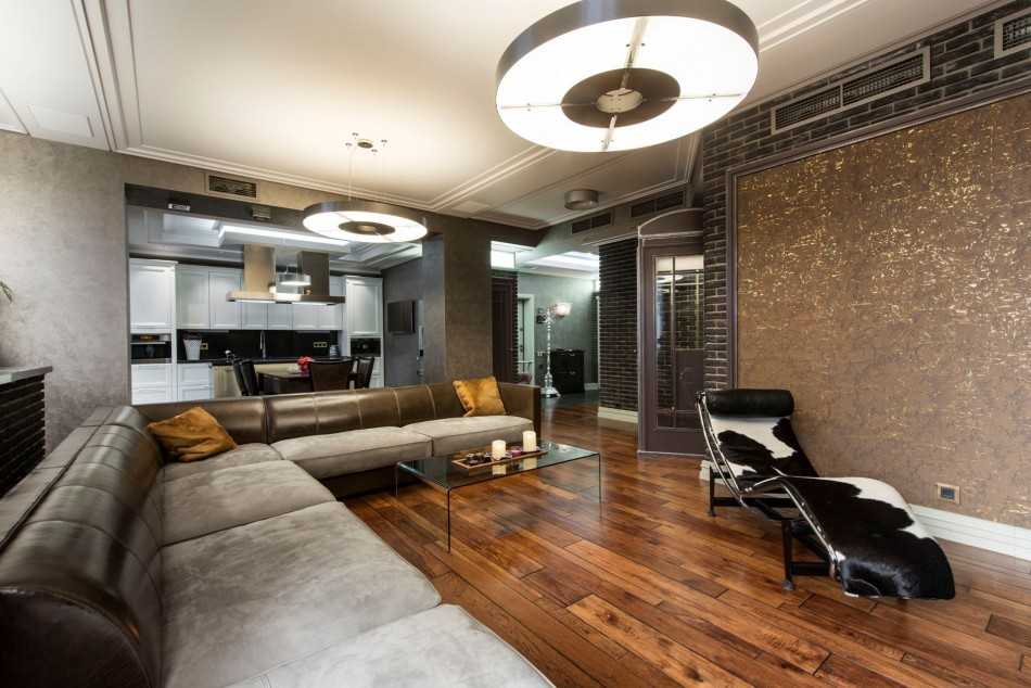 Интерьер гостиной с высокими потолками украсит конструкция из вентиляционных труб или потолочных балок. Стены могут быть отделаны кирпичной кладкой, деревянными панелями или грубо оштукатурены. Напольное покрытие выполняют из ламината или техникой наливного пола. Натуральный бетонный пол покрывают небольшим ковром с коротким ворсом.