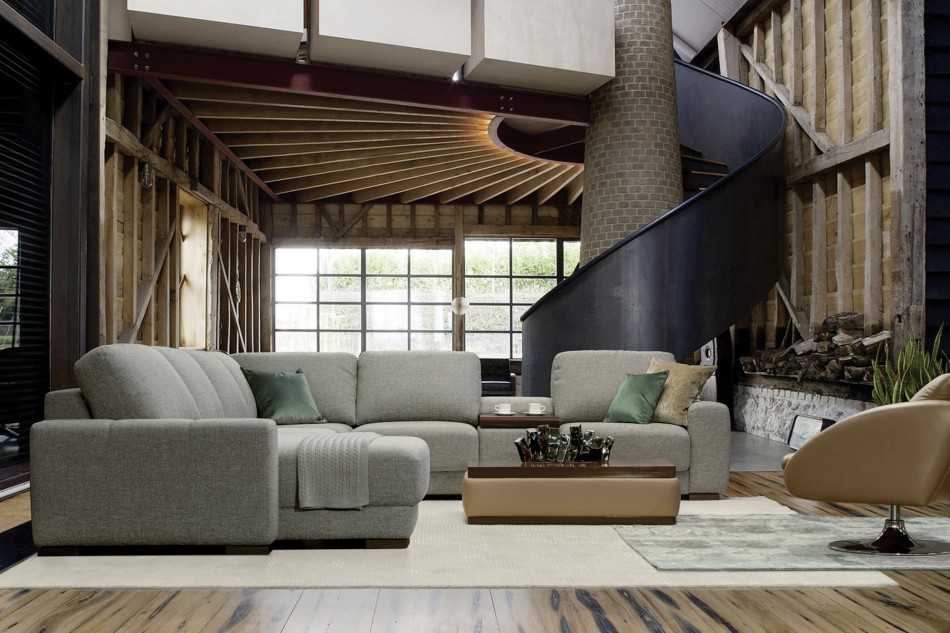 В основном центр гостиной в стиле лофт — мягкая мебель, вокруг которой расставляют другие предметы мебели. Если гостиная не маленькая и когда размеры комнаты позволяют, выбирают один крупный угловой или прямой диван с обивкой из фактурной замши, грубой мешковины или кожи. Его располагают напротив телевизора или камина.