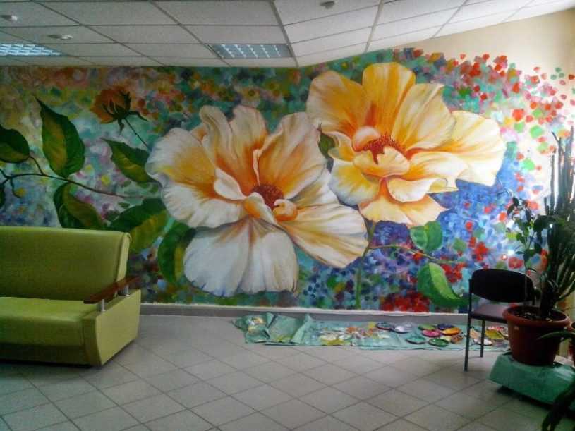 Но важно помнить, большой размер и пестрая цветовая гамма росписи предполагает наличие большой площади. Перед нанесением рисунка, выбранную поверхность нужно обязательно покрыть водоэмульсионной краской и выжидать время до полного ее высыхания