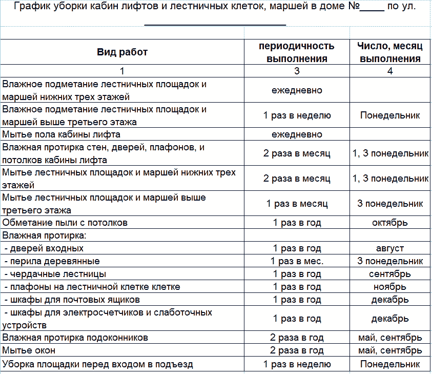 Как бы то ни было, чтобы не возникало недоразумений и споров, а подъезд всегда блестел, нужен общедоступный и удовлетворяющий всех график, согласно которому выполняется уборка.
