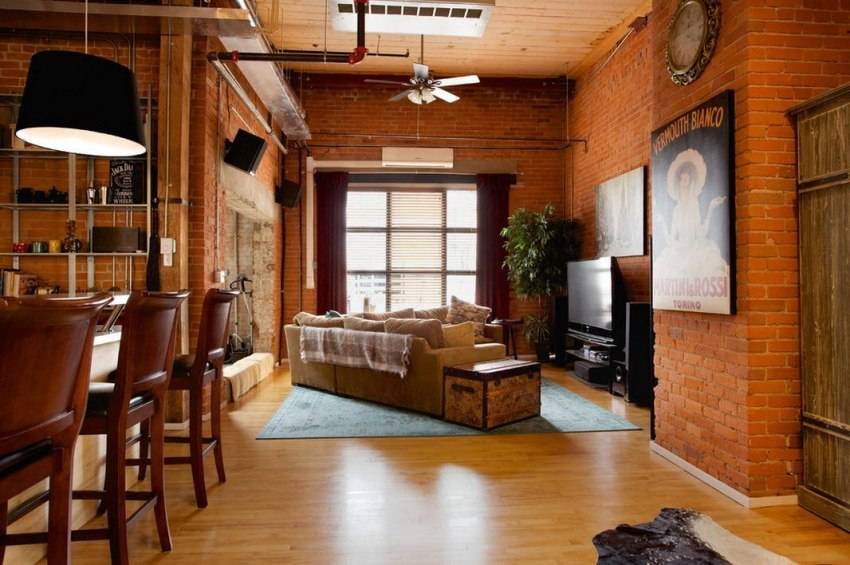 Лофт. С Лофтом все просто. Стены здесь отделывать не нужно. Кирпичная кладка, холодный бетон и небрежная покраска — основа самого популярного ныне стиля.