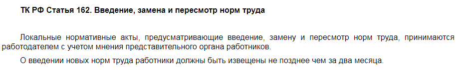 Компания может самостоятельно изменить нормативы. Однако работодатель должен письменно предупредить об этом сотрудника как минимум за 2 месяца до вступления в силу новых требований. Об этом напрямую говорится в Трудовом кодексе (статья 162).