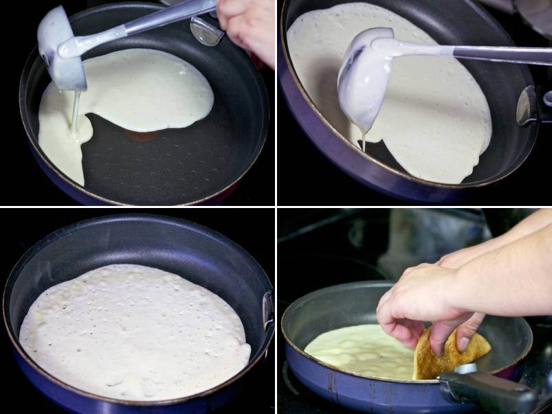 Продолжаем поворачивать, Пока не сформируется тонкий блин. Затем обжариваем до тех пор, пока не подсохнут края, а низ не станет золотистым.