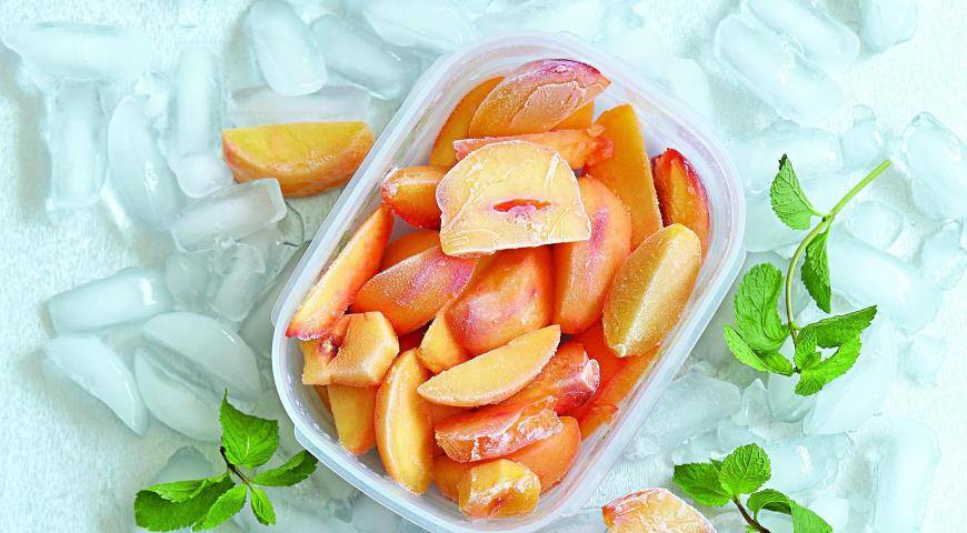 Далее дольки персиков раскладывают на ровной поверхности, застеленной полиэтиленом. В таком виде они отправляются в морозильный шкаф на несколько часов. После того как кусочки основательно промерзли, их пересыпают в отдельную емкость и снова убирают в морозилку.