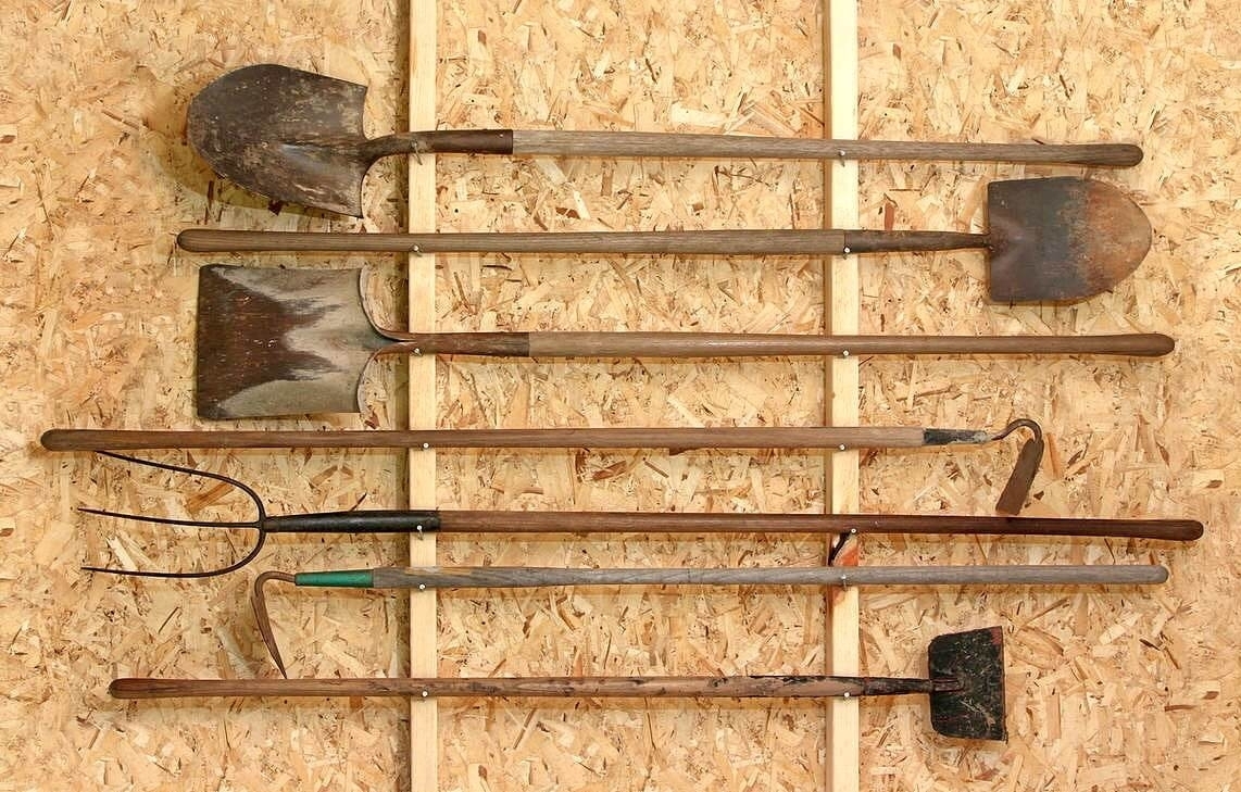 Обратите внимание! При хранении на стенах потенциально опасных предметов, таких как лопата, грабли, тяпка, серпы, нужно убедиться в том, что они там надежно закреплены и не упадут. В противном случае последствия могут быть самые разные и не всегда положительные
