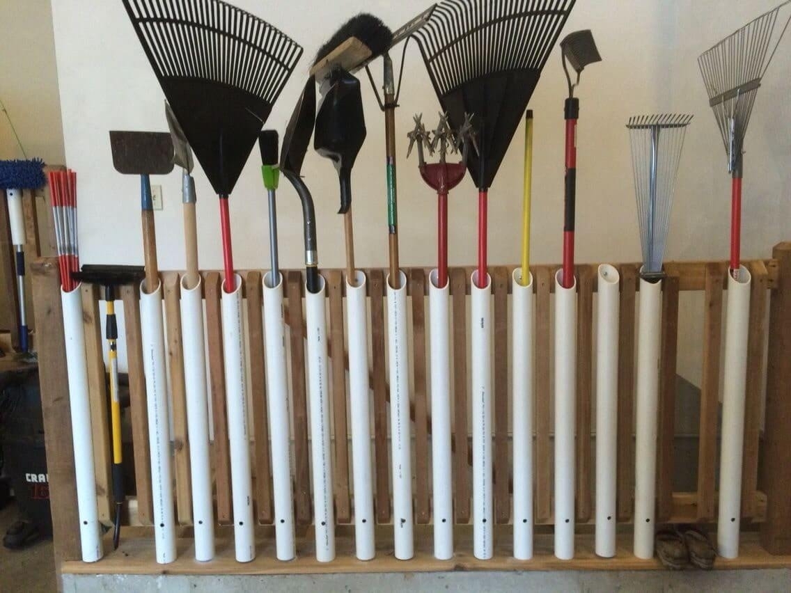 Из ПВХ-труб удастся сделать прекрасный вариант крепления для лопат, граблей и другого инструмента с ручками. Для этого отрезки труб стоит прикрепить к стене или другой вертикальной поверхности.
