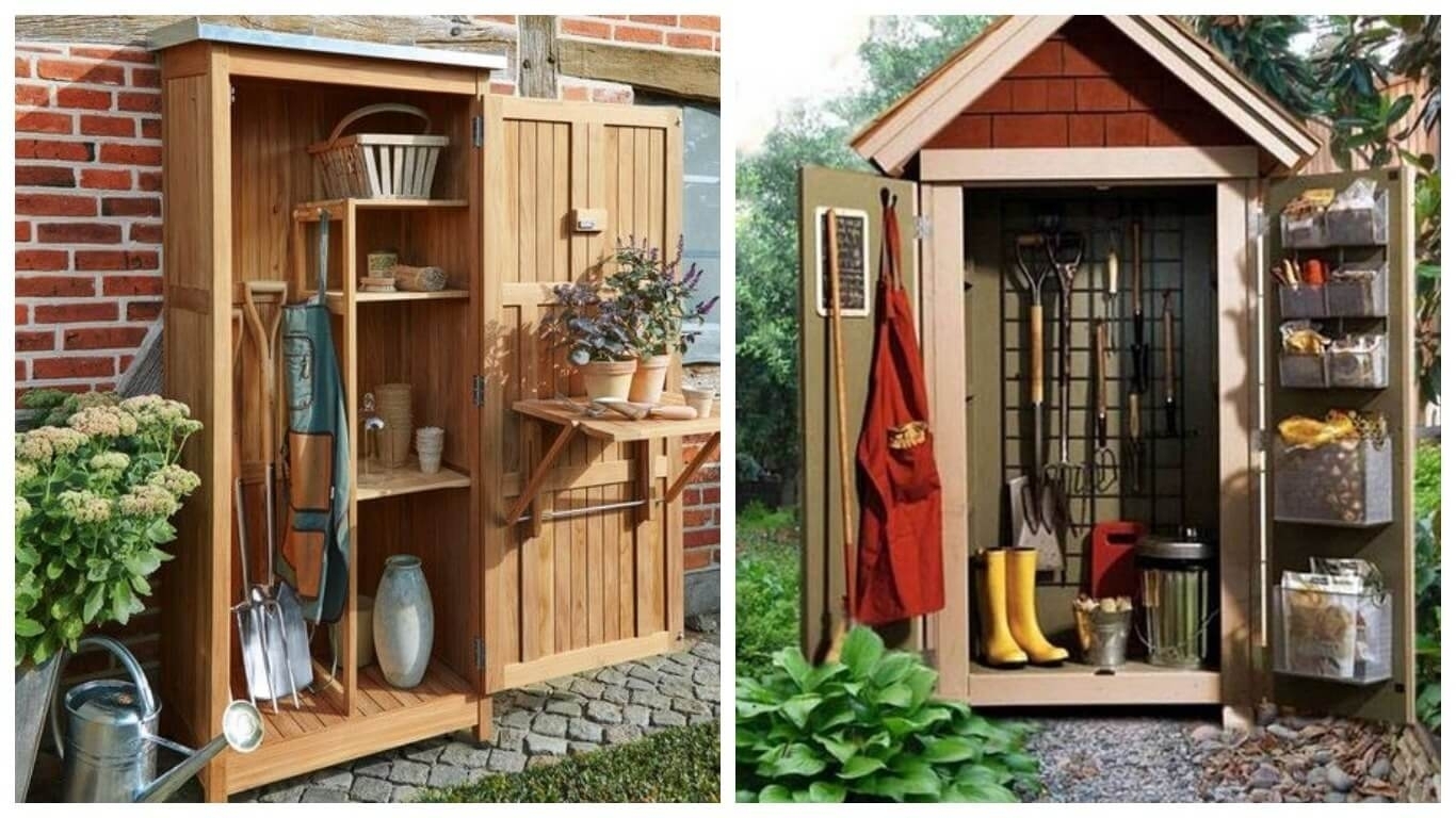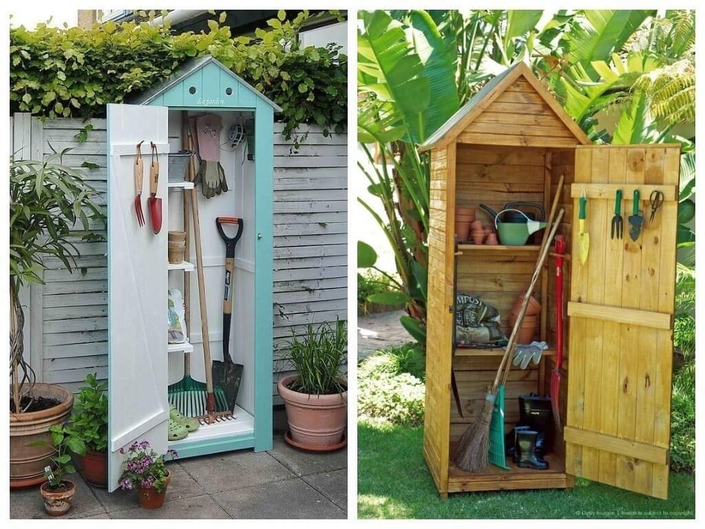 Идею с небольшим уличным шкафом использовали всегда, а особенно их устанавливали на участках, чтобы хранить только садовые приборы. Конструкция довольно-таки простая в монтаже, ее можно даже сделать из металла. Это очень удобно. Например, вам необязательно теперь хранить лопату в сарае, а дорогой секатор по типу Fiskars дома, все инструменты без риска можно оставлять в таком шкафчике. Преимущества такого сооружения: