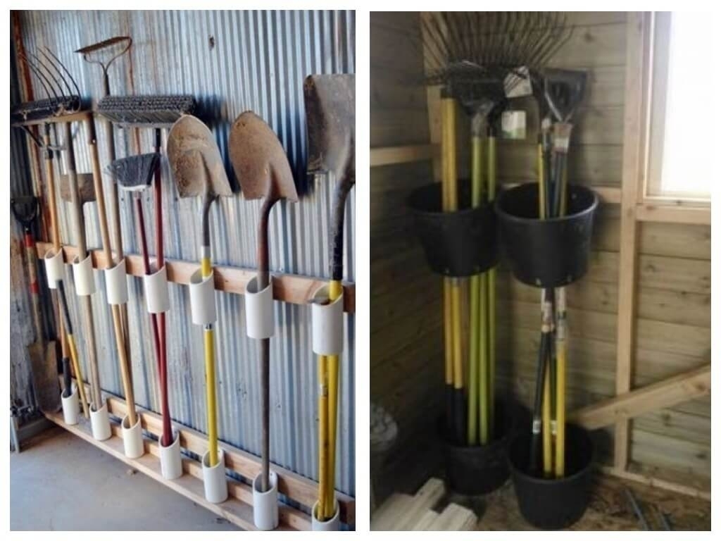 Грабли, тяпки, метлы и все прочие крупные садовые инструменты на длинных черенках очень удобно вставлять в держатели, сделанные из обычных сантехнических труб. А лопаты и другие инструменты с ручкой можно подвешивать на крючки. Но еще лучше – на двойные штыри, тогда они будут крепко держаться.