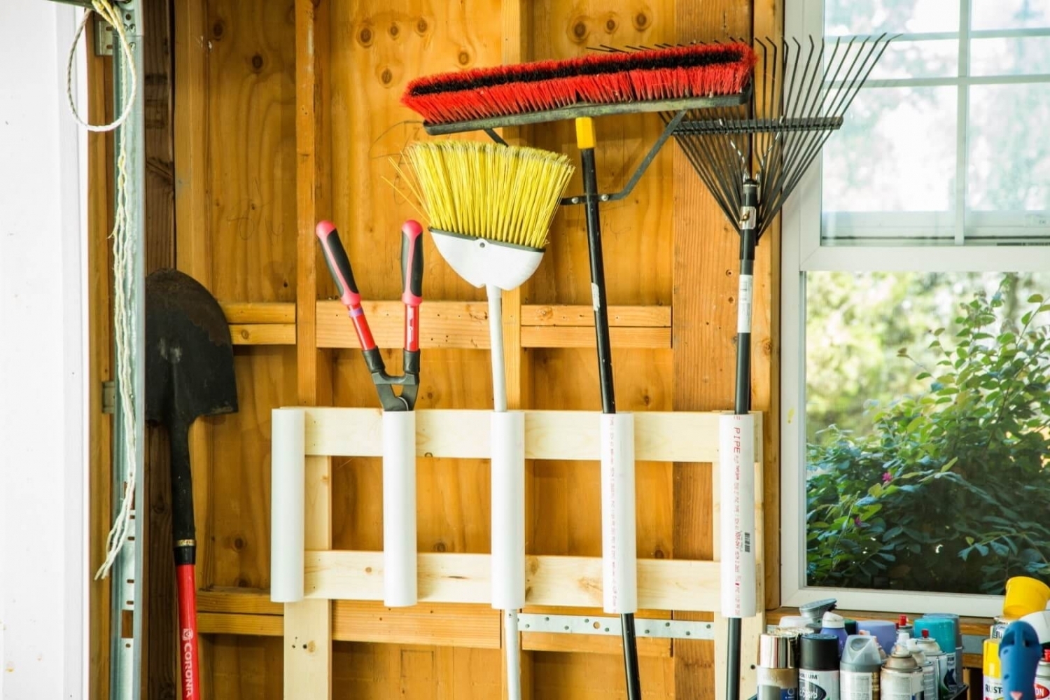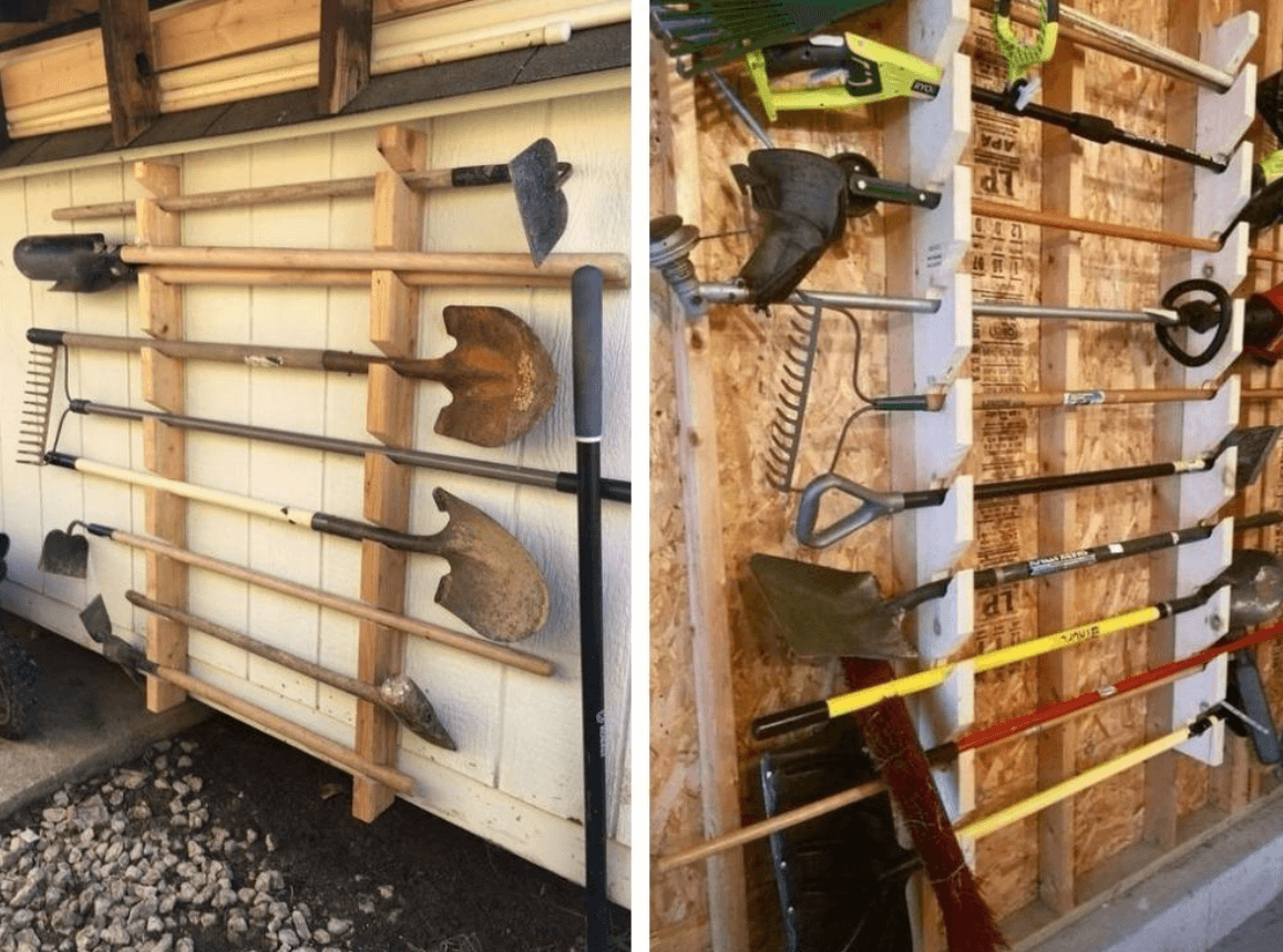 Идея 4: подвесить лопаты и грабли на стену или вставьте в ящик