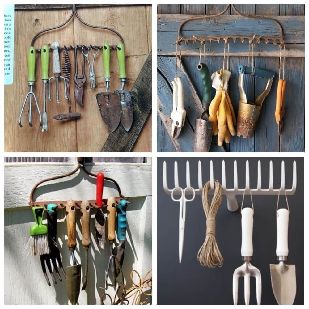 Специалисты не советуют выбрасывать инструменты, которые уже не используются. Так, грабли отлично подойдут для создания вешалки для небольших инструментов. Для этого их стоит закрепить на вертикальной поверхности.