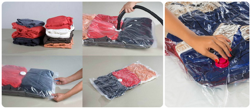 Другой вариант – вакуумные пакеты (мешки из полиэтилена на молнии и с отверстием для откачивания воздуха). Эти пакеты хороши тем, что упакованная в них одежда занимает мало места в шкафу (объем одежды уменьшается из-за откаченного воздуха), а также их можно использовать в поездках и путешествиях.