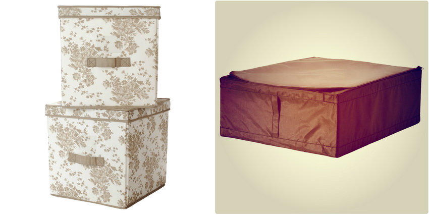 Для более мелких теплых вещей подойдут любые картонные коробки. Их недостатки – неустойчивость к влаге и доступность для насекомых. Также можно использовать для хранения зимних вещей большие пластиковые сумки на молнии (защищают и от влаги, и от моли) и дорожные чемоданы (если не планируете пользоваться ими в межсезонье).