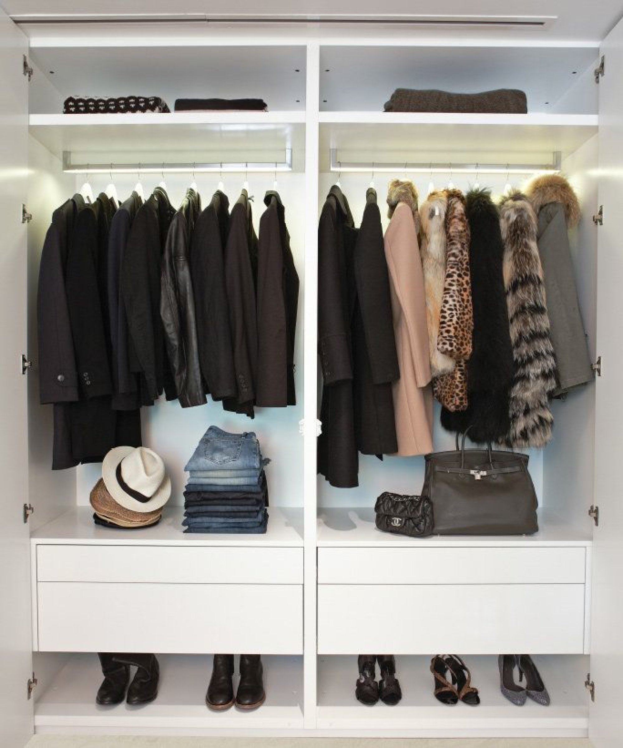 Если места в шкафу и гардеробной достаточно, то коробки, контейнеры и пакеты с упакованной одеждой и обувью можно разместить на верхних полках, то есть в местах, которые не используются для ежедневного хранения вещей. Можно разложить часть одежды в ящики, которыми снабжены диваны, кровати, кресла, пуфики, или просто задвинуть под кровать.